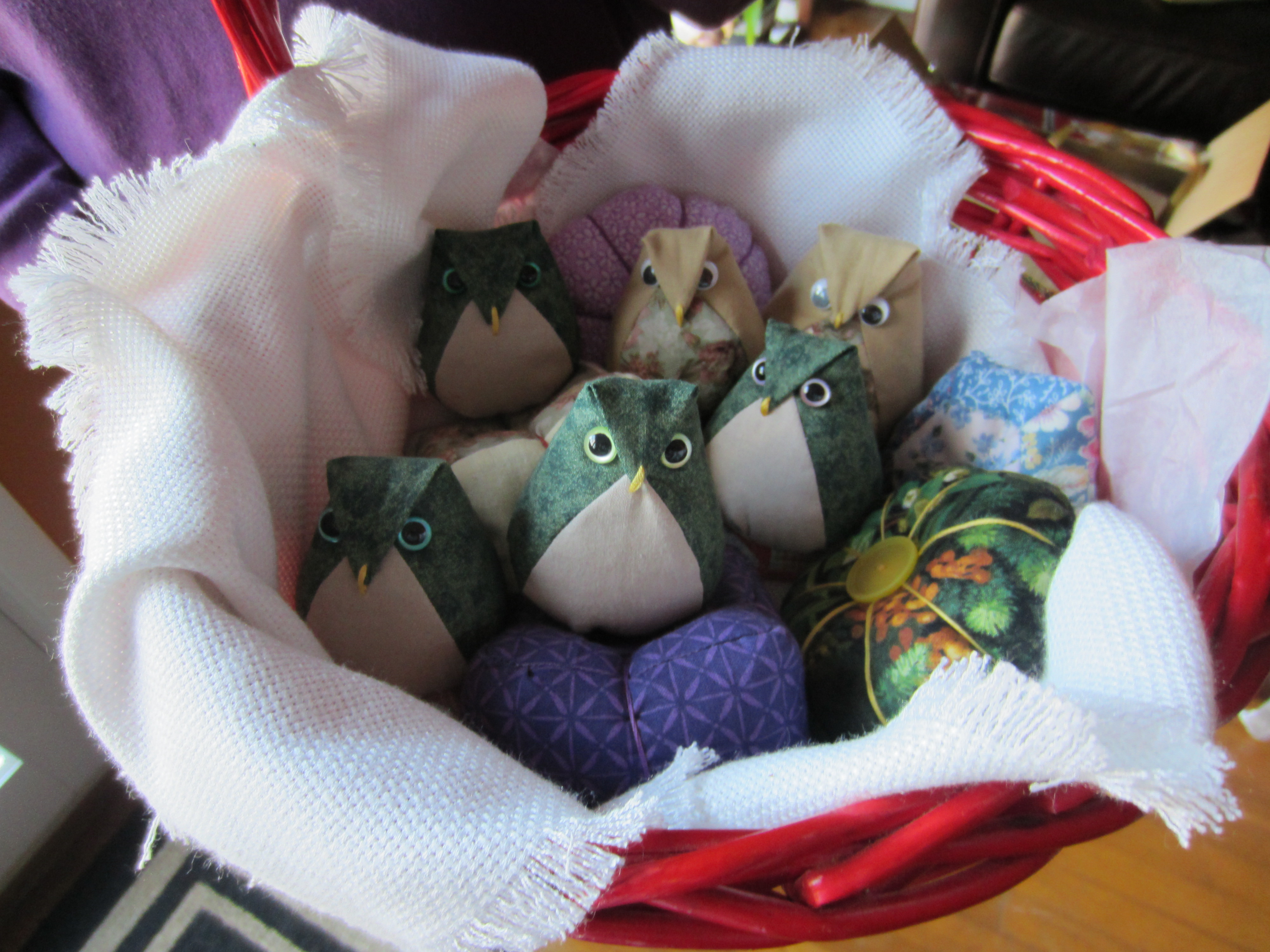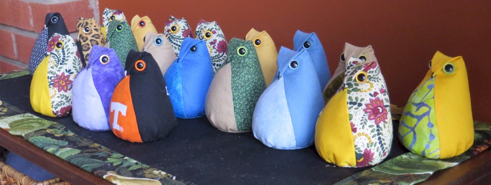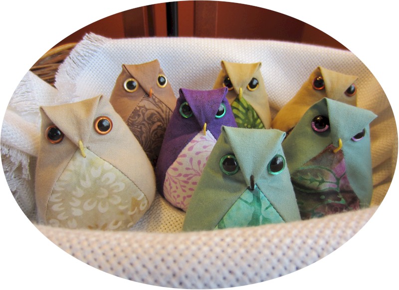 | These little owls were a huge hit with my family and friends when I gave them away for Christmas in 2013. The owls started out as a pin cushion project but then gained a life of their own. They have evolved over the years. I have made around 200 of these little guys and gals. I carry one in my pocketbook for that unexpected moment when you meet someone and know that an owl friend will be welcomed with a chuckle. |
